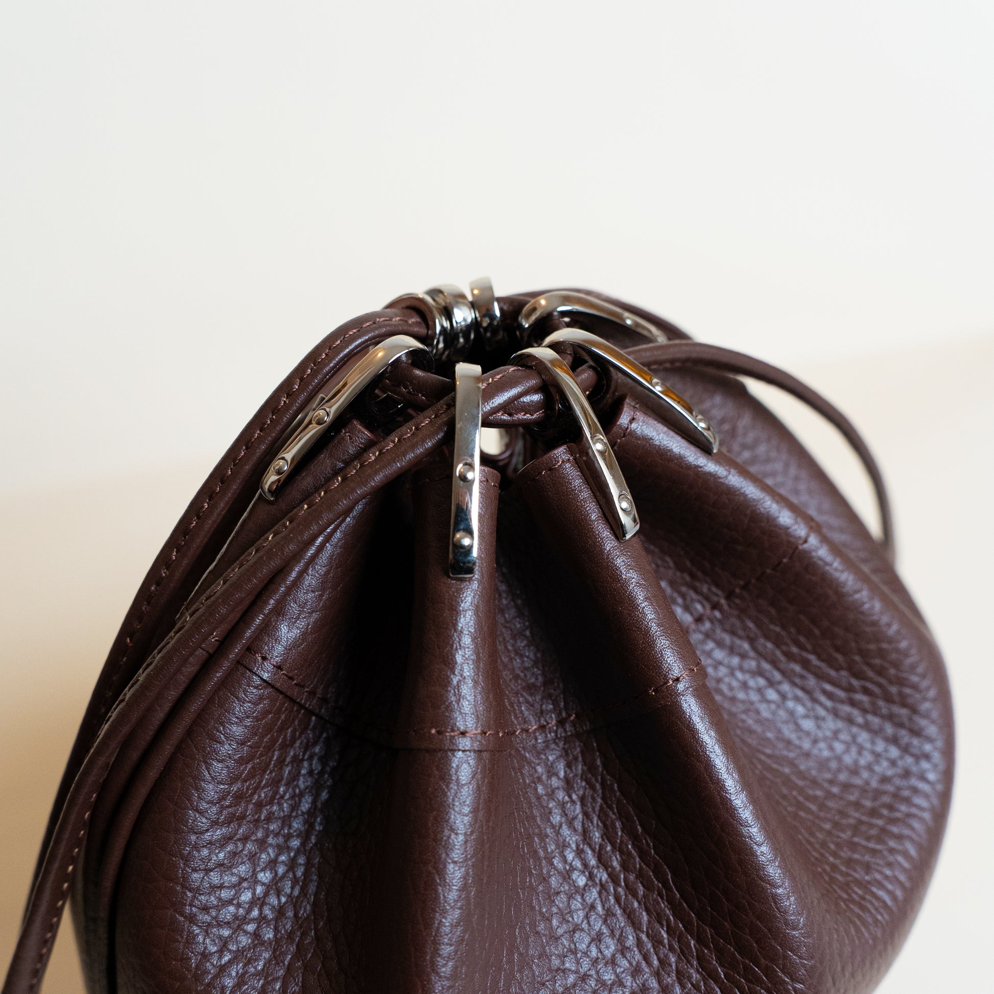 上部の金具(通称 Pコキ)は、特注で製作したオリジナルパーツ。取り付けには、金具の開口部から真鍮釘を通し、先端を切り落としてハンマーで潰す“カシメ”という技法を使用しています。職人が一本ずつ手作業で行う工程のため、同じものは二つと作れないほどの手間と時間を要します。