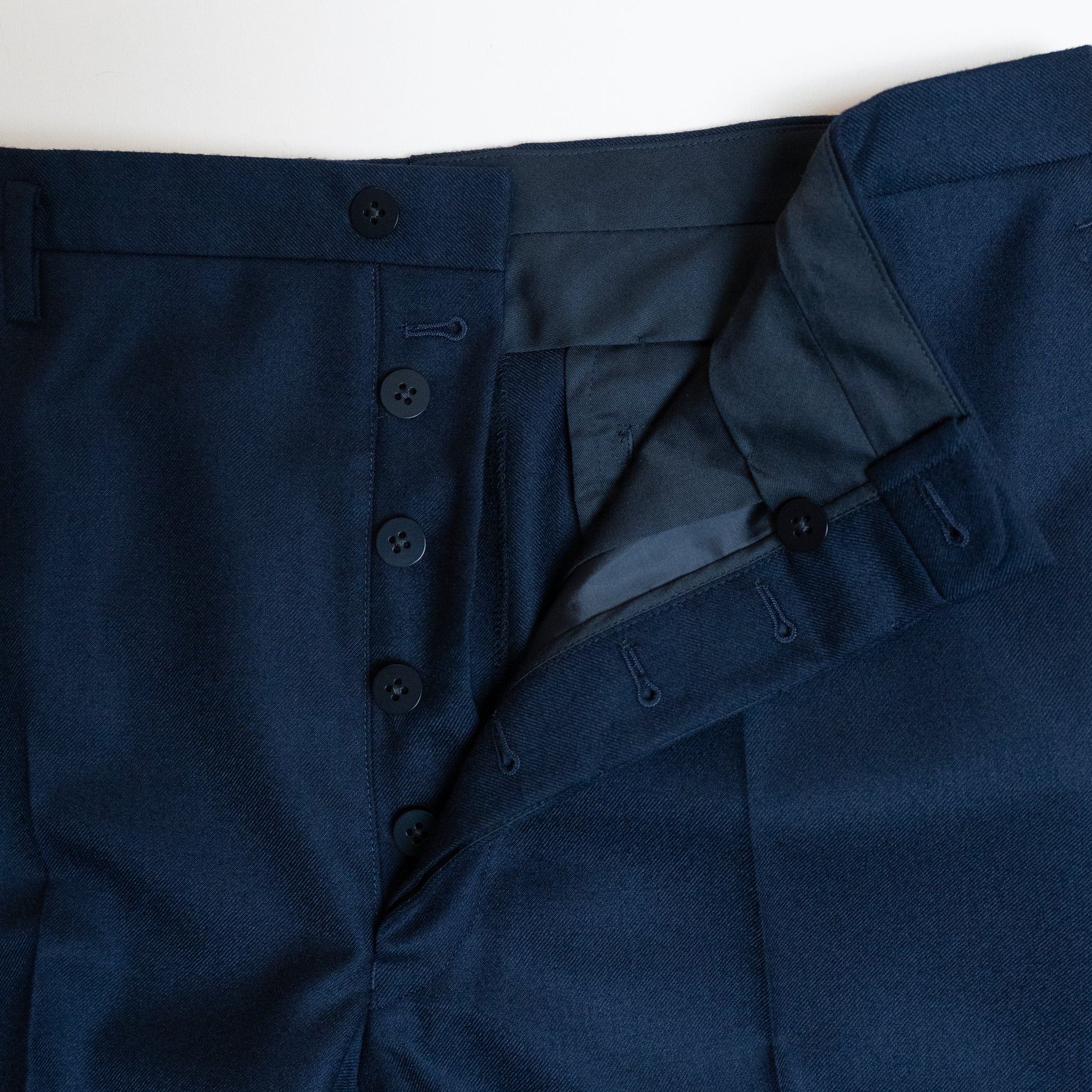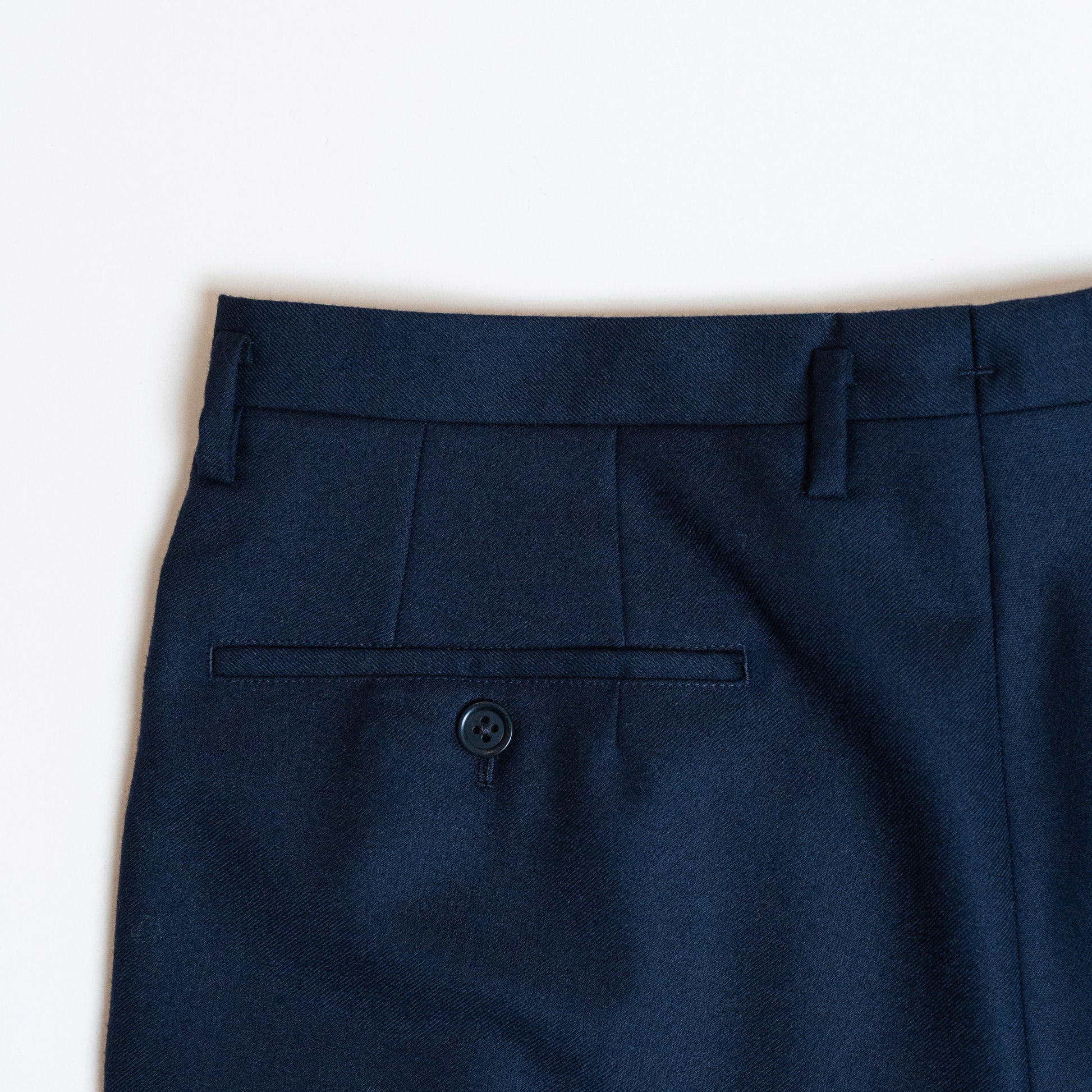 トラウザーズはクラシックなディティールを踏襲し、ドロップループ、ボタンフライ、ヒップダーツはポケット口を貫通した仕様を採用しています。